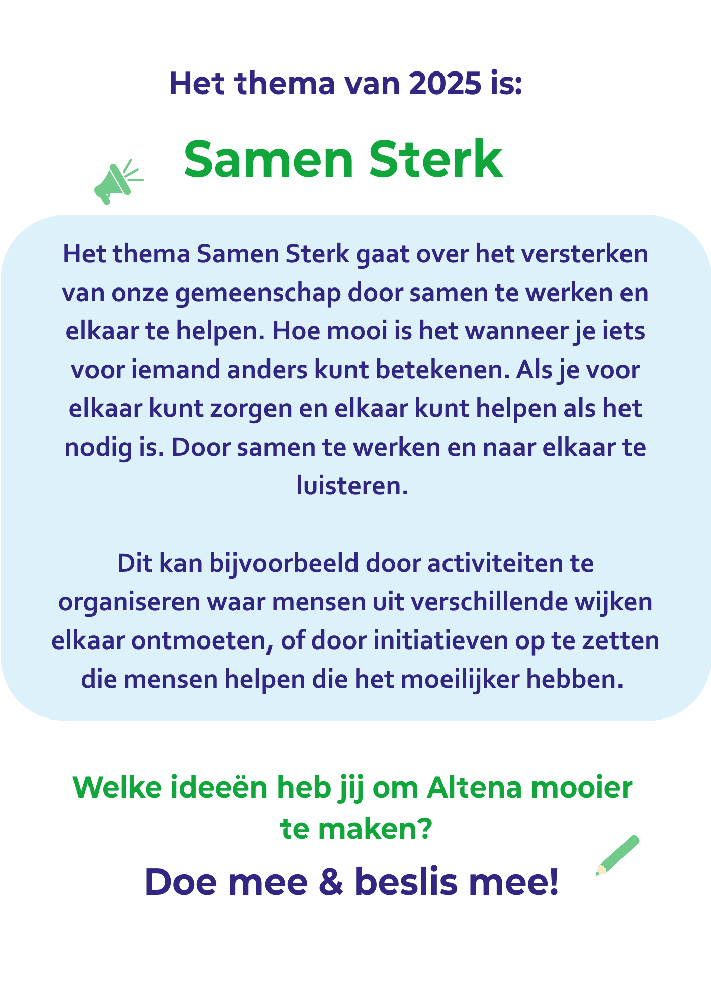 Jouw stem telt en jouw ideeën maken het verschil! Daarom nodigen we je van harte uit om deel te nemen aan het Inwonersbudget van Altena. Dit is dé kans om jouw idee in te dienen voor Altena.